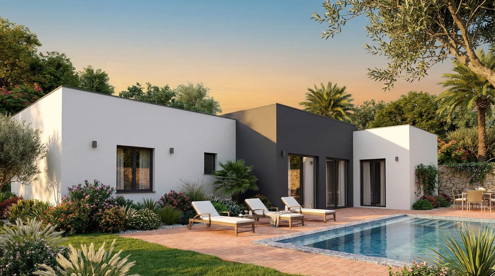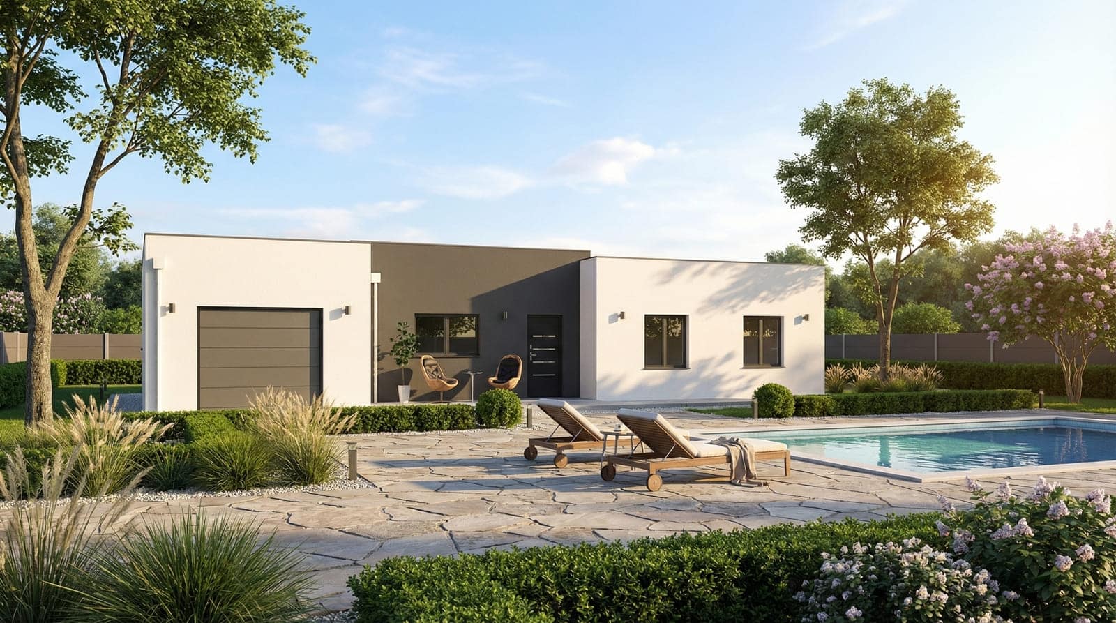La Vianna est une magnifique maison contemporaine de plain-pied offrant une surface totale de 131 m², garage inclus. Ses volumes géométriques, ses larges ouvertures et son toit plat, caractéristiques du style, sont particulièrement mis en valeur par le choix des couleurs de façade, qui jouent avec succès sur le contraste blanc/anthracite. Une maison conviviale au look hyper moderne !